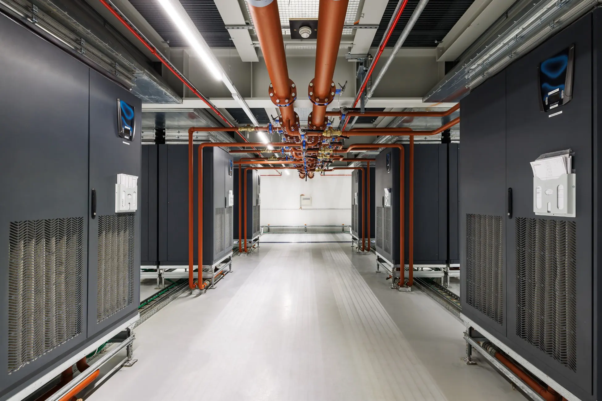 We betreden het datacenter langs de dienstingang en begeven ons richting de zaal waar de Tier-1-supercomputer binnenkort zal staan. We passeren eerst door een gang met daarin deksels die toegang geven tot het grote onderaardse regenwaterreservoir. In een ruimte wat verder staan grote machines die de lucht conditioneren, naast een grote warmtewisselaar. Daar kan de restwarmte van het datacenter omgezet worden in bruikbare hitte.