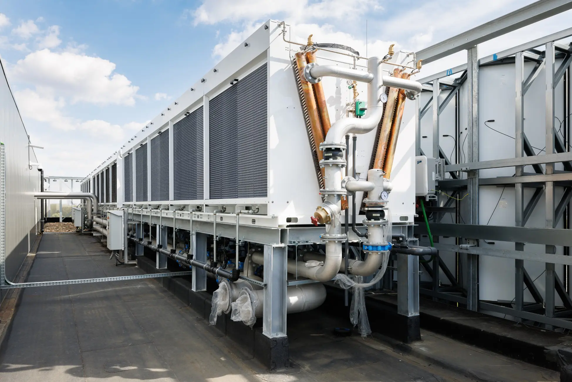 Voor een verder voorbeeld van duurzame datacenter-innovatie nemen we de lift naar de bovenste verdieping. Die technische ruimte illustreert meteen welke jobs AI in de toekomst niet zal vervangen: die van elektricien of loodgieter. We banen ons een weg langs een indrukwekkend kluwen van grote en kleine buizen, pompen en elektrische bekabeling naar een deur richting het dak.