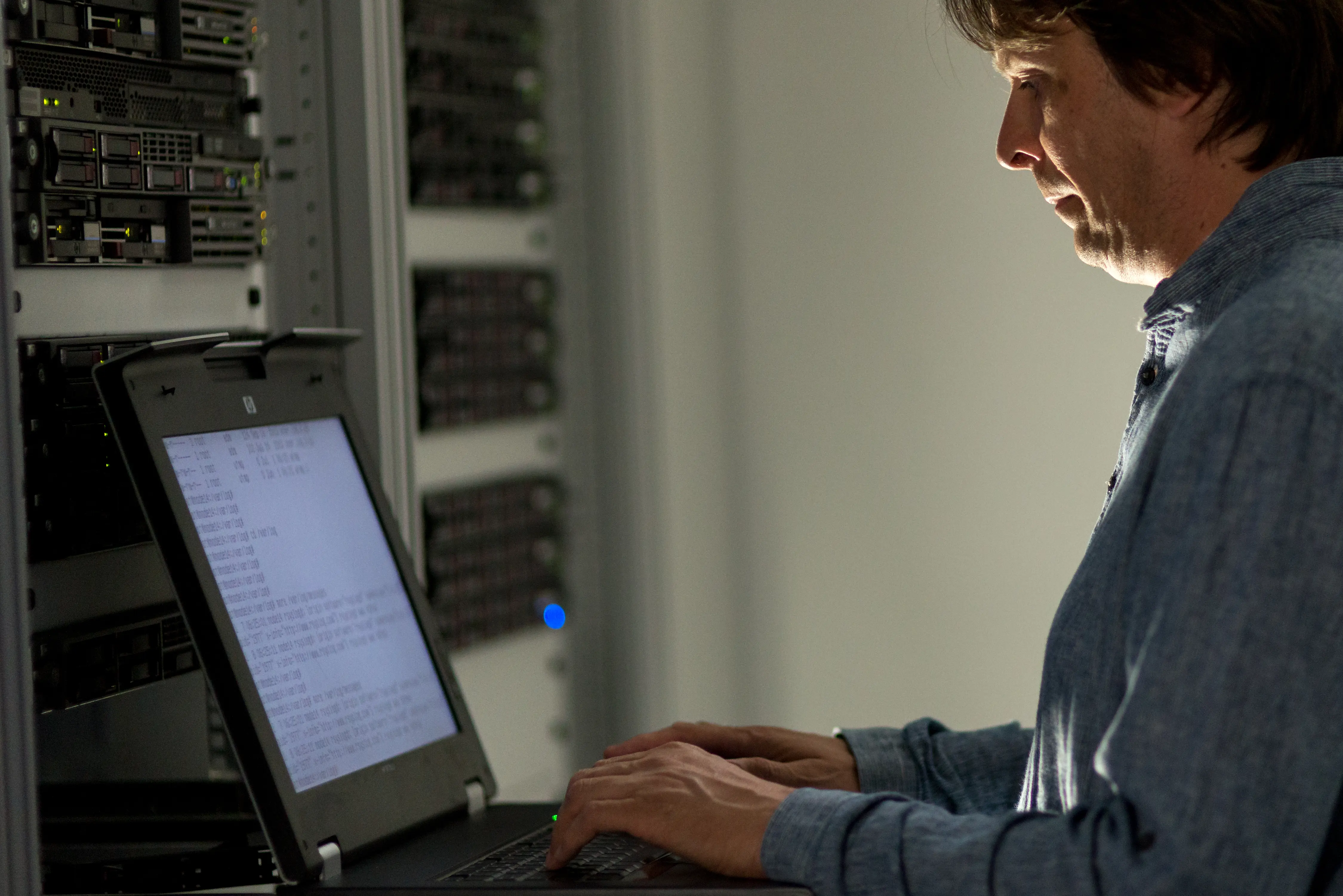 Decloedt begeleidt ons verder naar het datacenter van de afdeling Remote Sensing en laat ons achter in de capabele handen van Yves Verheijen, die meebouwde aan het datacenter en het momenteel onderhoudt. In deze ruimte worden alle data van de satellieten ontvangen.