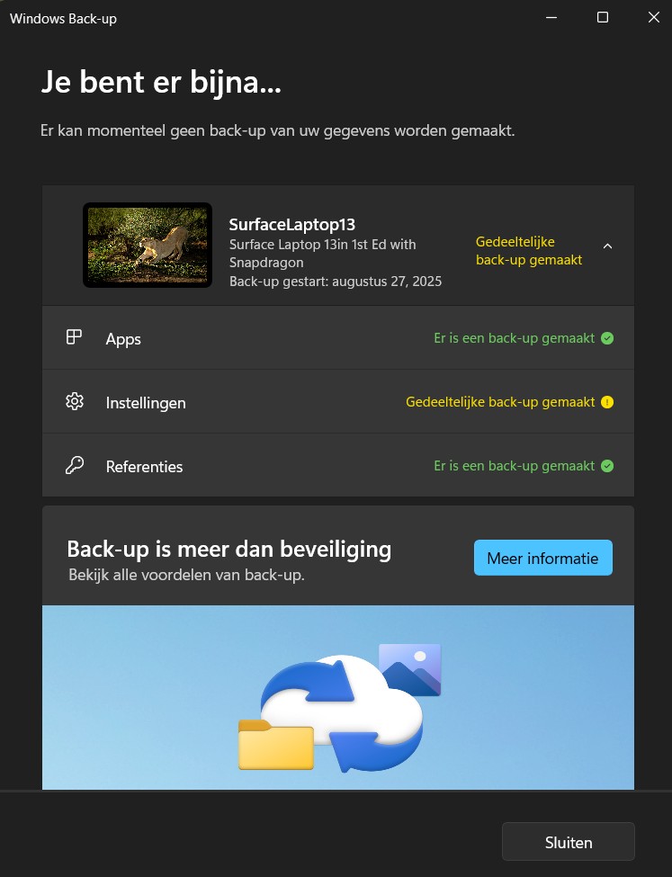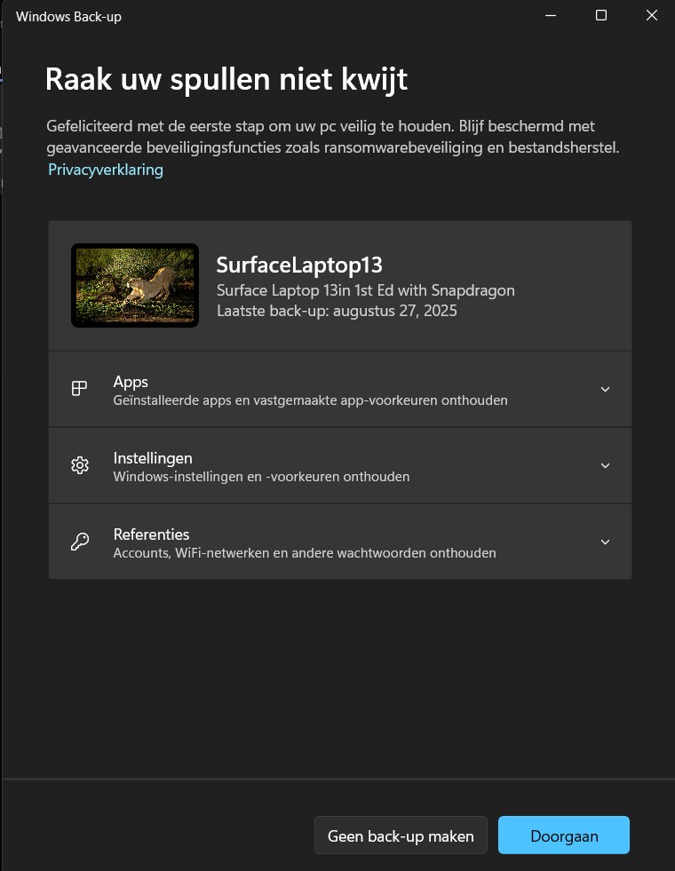 Klik nu simpelweg op Doorgaan om de back-up in gang te zetten. Afhankelijkheid van de hoeveelheid GB duurt dit enkele seconden tot minuten. Om je bezig te houden, voegt Microsoft een link naar een webpagina die je de voordelen van back-ups uitlegt. Of je kan onze back-up-gids lezen in tussentijd. Is de back-up klaar? Vouw het menu even open om te controleren of alles wel is overgezet. Een geel of rood symbool geeft aan dat de back-up maar gedeeltelijk of niet gelukt is. -