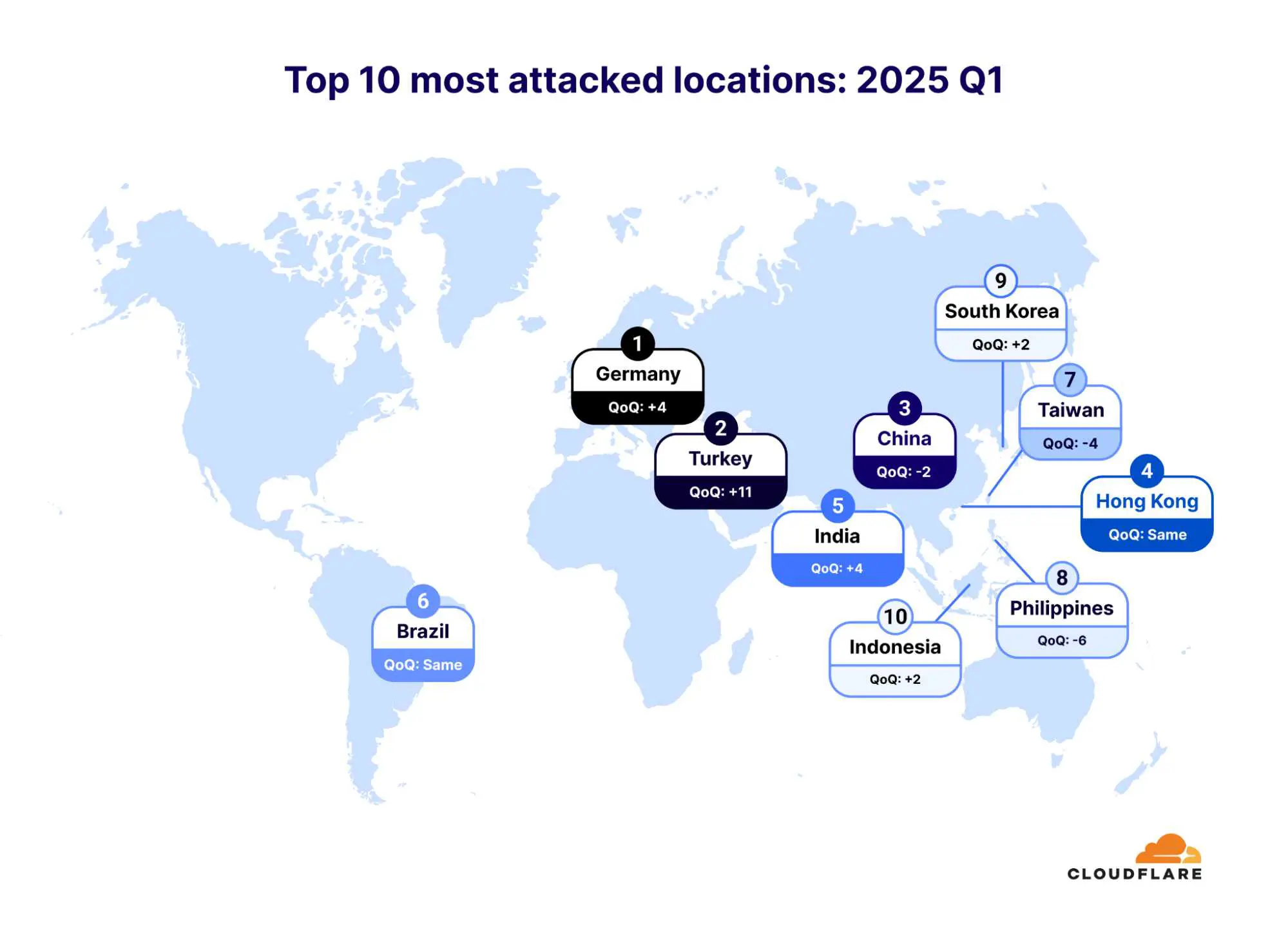 Wat de geografische spreiding betreft, werd Duitsland het voornaamste doelwit van DDoS-aanvallen, gevolgd door Turkije en China. Opvallend is dat Hongkong de belangrijkste bron was van aanvallen, met Indonesië en Argentinië als tweede en derde. Op de heatmap van Cloudflare is te zien dat België nog niet tot de belangrijkste doelwitten behoort.
