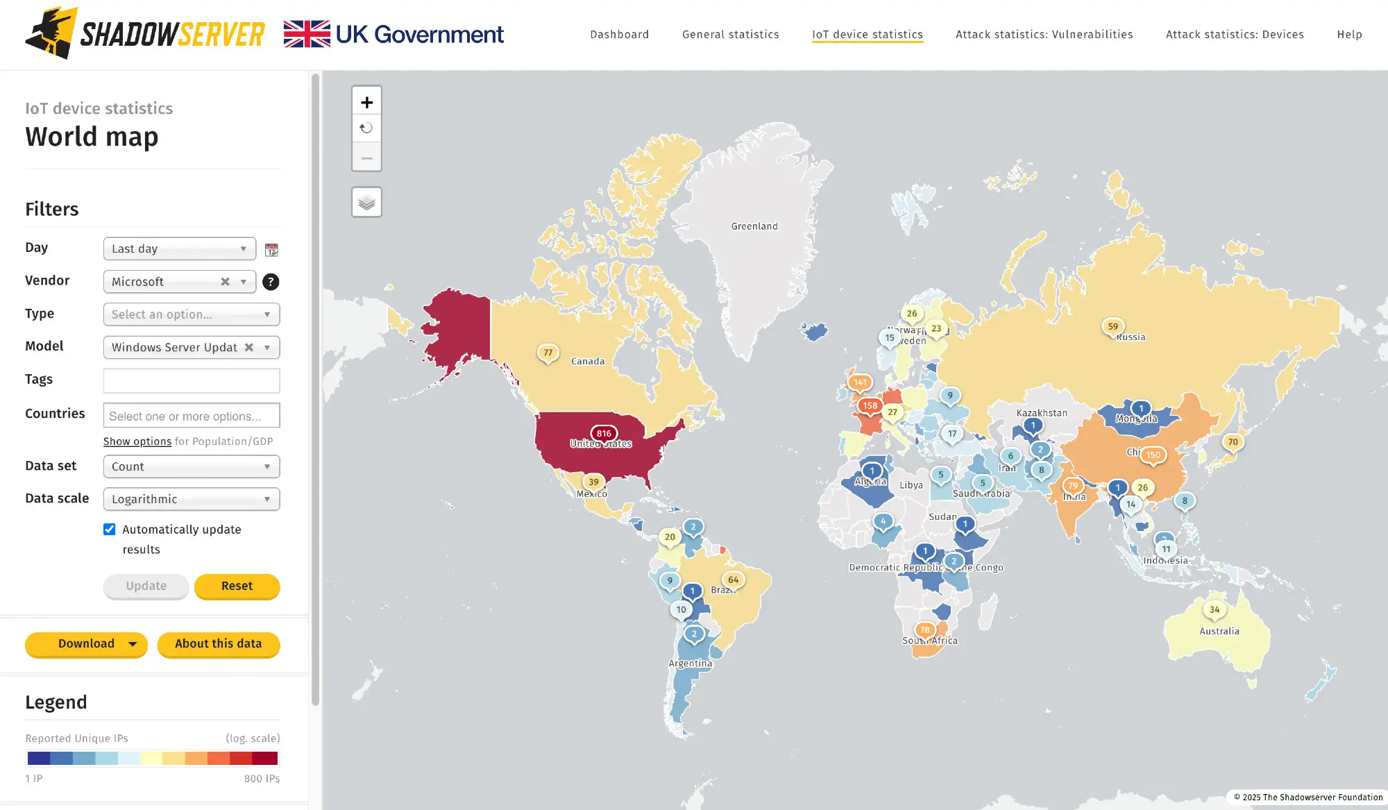 Volgens schattingen van ShadowServer waren op 25 oktober minstens 2.800 servers wereldwijd kwetsbaar, deelt het in een post op Bluesky. Het Europese epicentrum ligt in Frankrijk (158) en het Verenigd Koninkrijk (141).