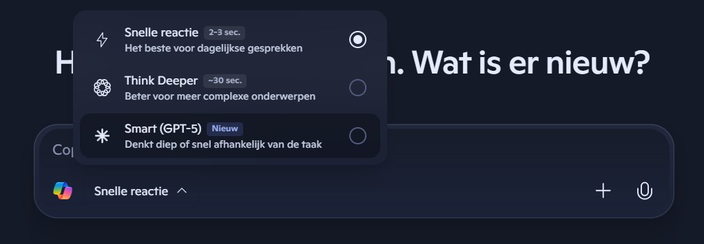 GPT-5 is nog maar net voorgesteld door OpenAI, met verbeteringen in algemene intelligentie, creatieve schrijfopdrachten, coderen en medische toepassingen. Een nieuwe functie stuurt vragen automatisch door naar het meest geschikte interne model op basis van complexiteit. Op de site moeten gebruikers GPT-5 nog handmatig activeren via een keuzemenu. De beschrijving van GPT-5 op de Copilot-website luidt: “denkt diep of snel afhankelijk van de taak”.