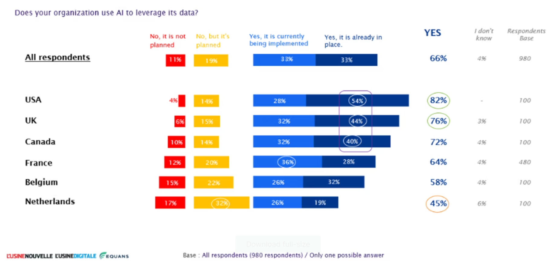 Voor de studie werden 980 besluitvormers bevraagd in zes landen: België, Nederland, Frankrijk, het Verenigd Koninkrijk, de Verenigde Staten en Canada. Daaruit blijkt dat Engelstalige landen zoals de VS, Canada en het VK meer resultaten halen uit data. Organisaties in die landen gebruiken vaker één centraal dataplatform, delen data tussen afdelingen en meten de ROI van datagebruik, wat leidt tot bredere adoptie.
