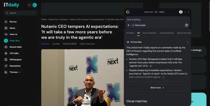 Google gaat ook online voor je op zoek naar informatie. Zo kan je je scherm volledig delen of een screenshot maken om door Lens te laten onderzoeken. Deel je het volledige scherm, dan zal Google enkel de pagina of venster gebruiken die op dat specifieke moment voor jou zichtbaar is. Google integreert zijn AI-modus, niet hetzelfde als AI Overviews, om via een chatvenster vragen te stellen.