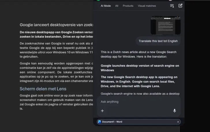 Hoewel Google groot geworden is op het internet, zet het bedrijf meer in op desktopversies van zijn applicaties. Onder andere Google Drive en Quick Share zijn ook op Windows beschikbaar. In het verleden probeerde Google zijn zoekmachine al eens in een pc-app te stoppen, maar die eerste poging mislukte.