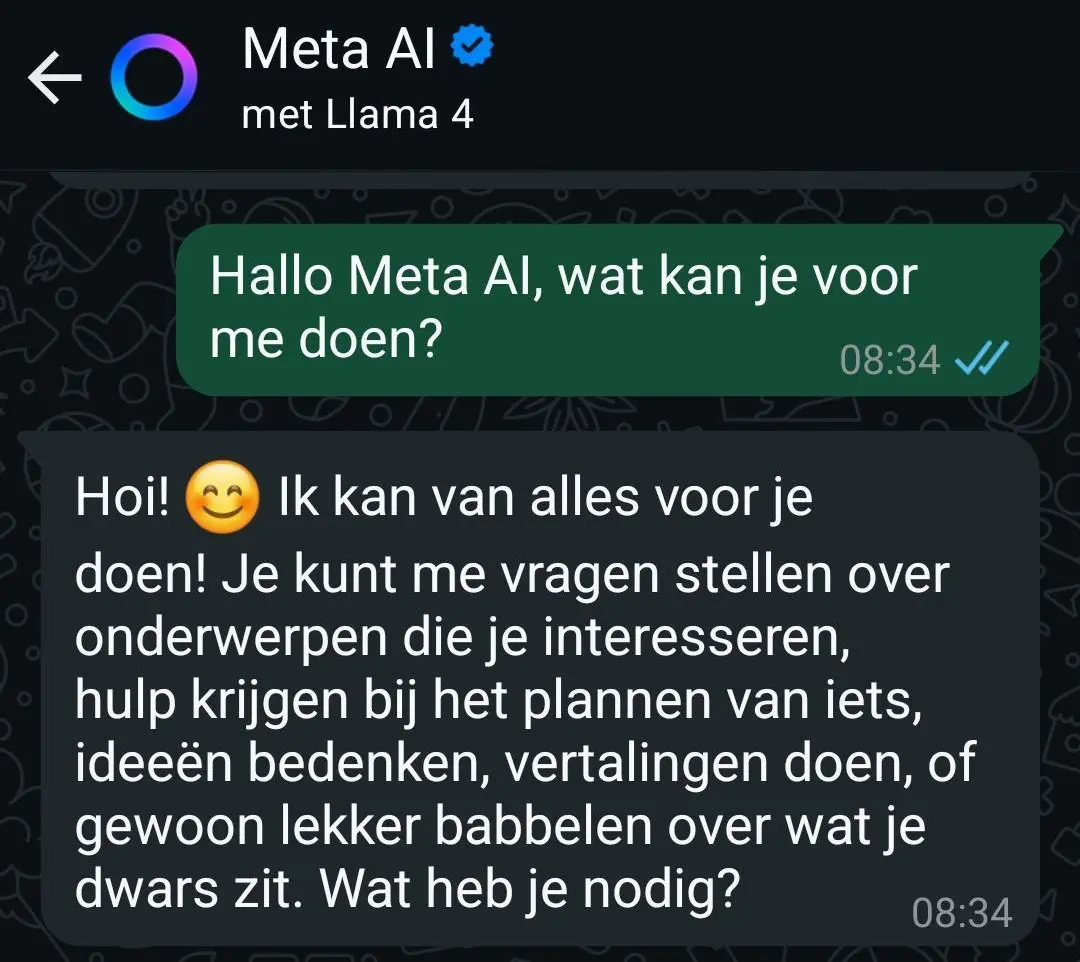 Het onderliggende model is Llama 4 en naast Engels en Nederlands kan Meta AI ook chatten in het Spaans, Frans, Duits, Italiaans en Portugees. Zoals het blijkbaar hoort voor AI-assistenten, is Meta AI altijd overmatig enthousiast en spaart het de emoji’s niet.