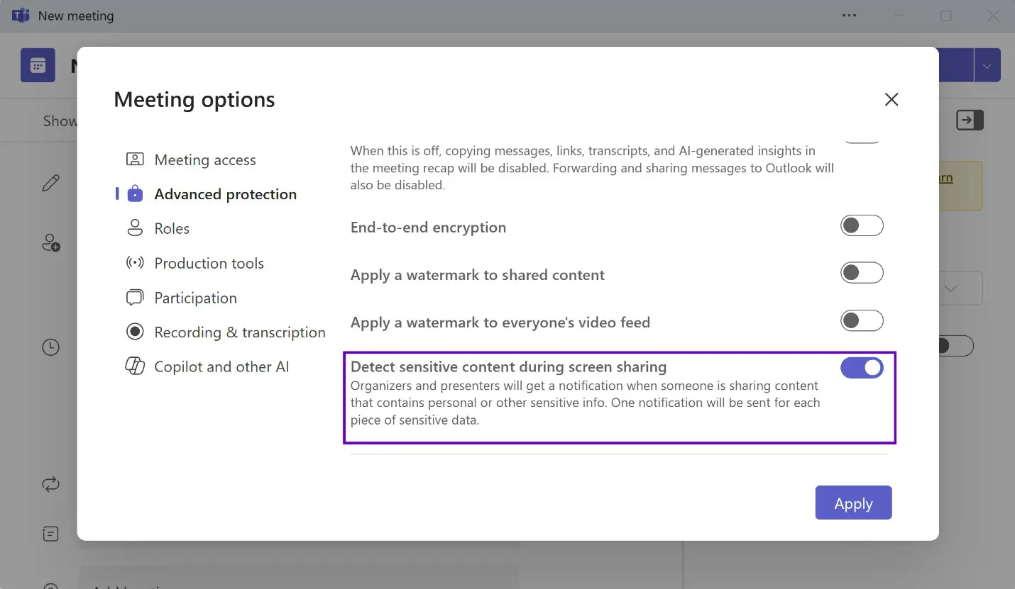 Staat er iets op je scherm dat je liever niet wil delen tijdens een vergadering? Teams waarschuwt je voor gevoelige inhoud voordat je je scherm deelt.